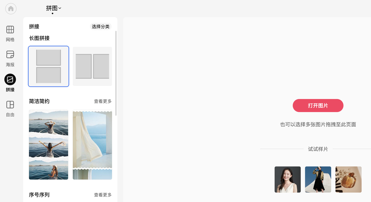 对于生活中需要用到的图片拼接制作长截图,可打开美图秀秀-拼图-拼接,在长图拼接中选择竖版拼图或者横版拼图(如下图)。
