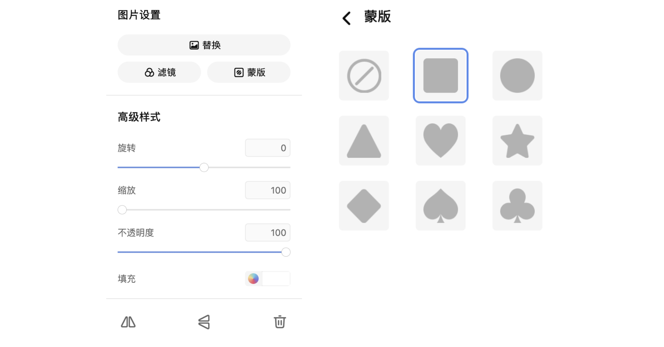 当所有的图片均以上传拼接后,单击某张想要制作为某类形状的图片,在右侧会出现图片设置的工具栏,点击蒙版之后就可以选择想要制作的形状图片