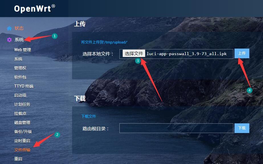 第一步:登录并打开路由器管理界面—“系统”—“文件传输”—“选择文件”—“选择存放的ipk软件包”—“上传”