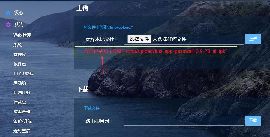 第二步:ipk 上传完毕后,会有如下图“文件上传成功”的提示