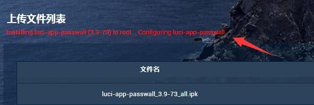 在点击“安装”后, 在“上传文件列表”会显示 “Installing luci-app-passwall (3.9-73) to root… Configuring luci-app-passwall.” (正在安装并配置 passwall)
