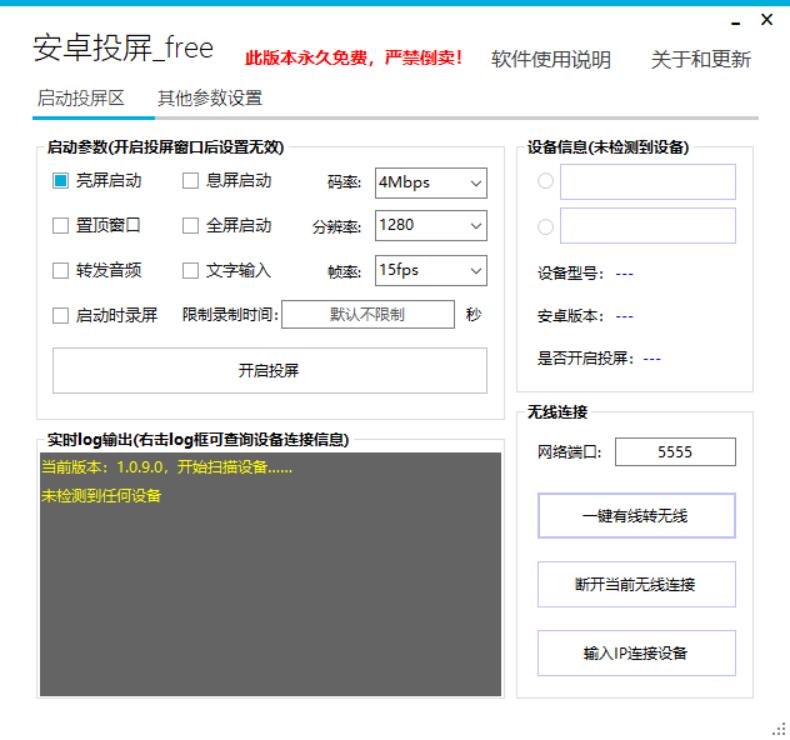 (5)无线投屏端口可自行设置,默认5555,IP可手动输入,请先选中右侧需要打开无线的设备;