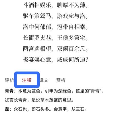 进入诗词界面,下滑点击【注释】即可查看关于这首诗词的注释。