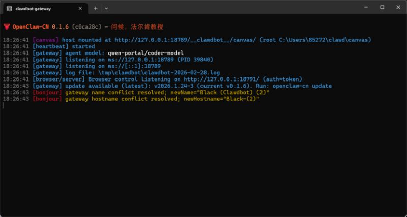 7、出现这个黑色窗口时,一定不要关闭!在整个 OpenClaw 的运行过程中都需要它的支持。
