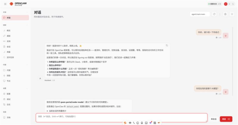 完成后,浏览器中会自动打开 OpenClaw 的仪表盘页面。在这个页面您就可以和 OpenClaw 对话,并给它发指令安排任务了。