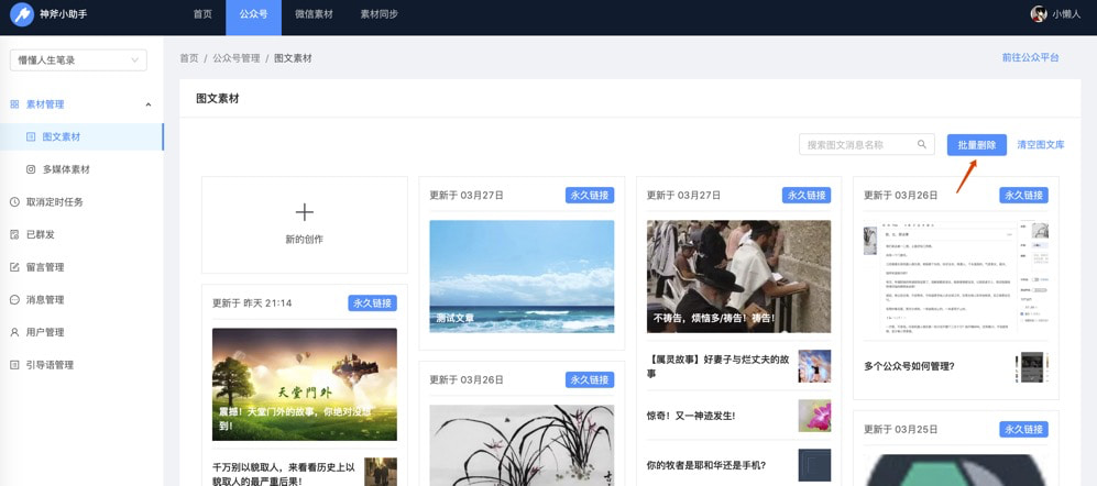 1、首先在浏览器中下载安装插件,然后在公众号管理找到素材管理,右上角可以看到批量删除按钮,点击它。