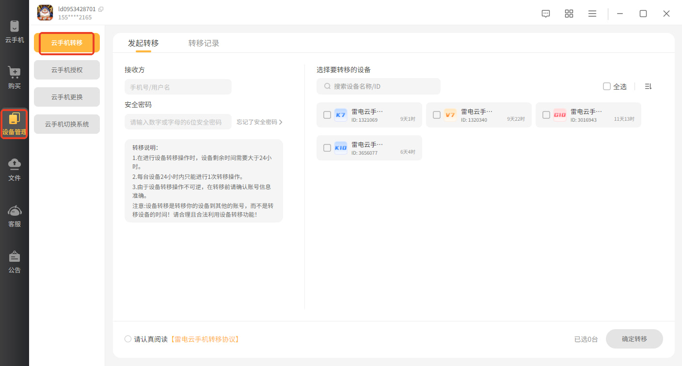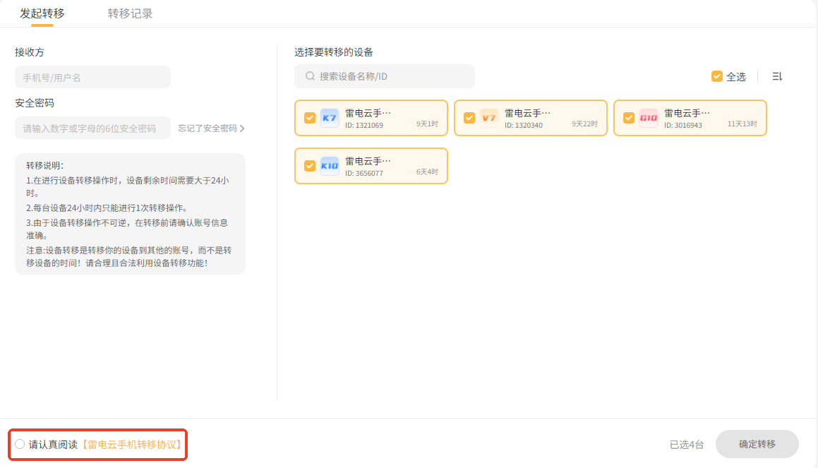 2、填写需要接收设备的手机号码或者账号,然后输入安全密码,勾选好设备,左下角的“请认真阅读”一定要勾选,最后点击“确定转移”。