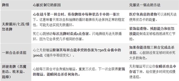 击败心形的理想卡组可以快速设定胜利条件,在第10回合战斗前造成750点伤害。这时心的自我增益会变得更强,并且会产生更多状态卡来堆积你的卡组。