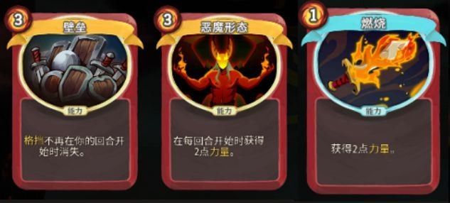 核心牌也有简化版,就像恶魔形态的牌有燃烧和观察弱点,都是能够单回合+3力量。可以用来顶替恶魔形态地位,也可以用来加速爆发,因为后面的BOSS越来越强,短时间内想快速叠加力量光靠一张卡是远远不够的。