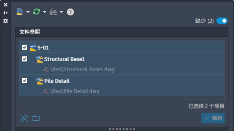 处理包含参照的图形时,通过新的“缺失”切换,可以切换到“文件参照”窗格的“缺失参照”视图。此视图仅显示缺少的外部图形参照 (xref) 文件。