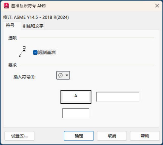 “基准标识符 ANSI”对话框包含最新的标准修订“ASME Y14.5 – 2018 R(2024)”。该对话框现在提供在远端插入符号的选项。在“要求”下,随“插入符号”选项一起提供了基准注释和螺纹注释字段。