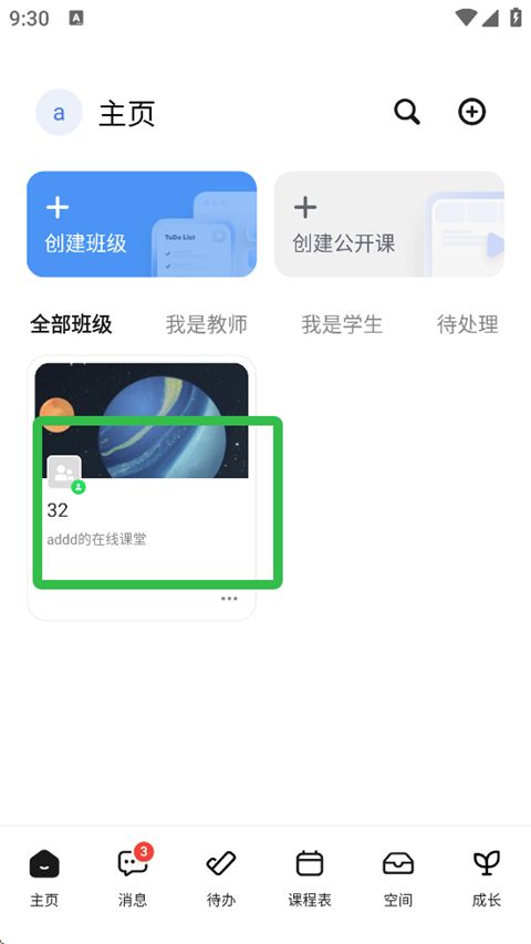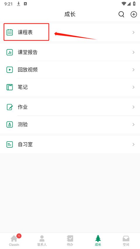 课程表、课堂报告、回放视频、笔记、作业、测验、自习室。