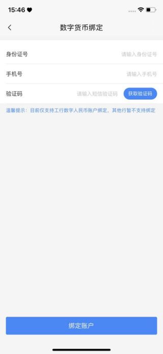 1、在太仓一卡通app首页,点击数字货币按钮,进入数字货币绑定页面,展示数字货币绑定页面绑定信息,包括身份证号输入框,手机号和验证码输入框,获取验证码按钮和绑定账户按钮。