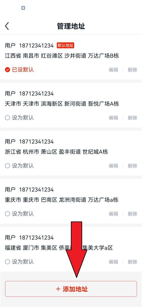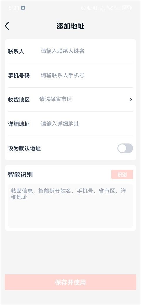 可按需开启"设为默认地址"开关,填写完成后点击"保存并使用",完成地址添加。
