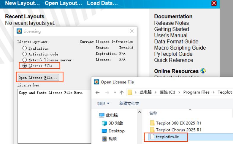 4、打开桌面上生成的软件图标,选择【license file】,点击【open license files】选择medicine文件下的tecplotlm.lic文件即可