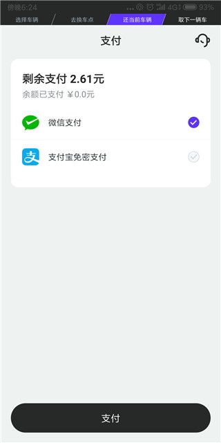 到达换车地点后,点击“开始换车”,归还并结算当前车辆。