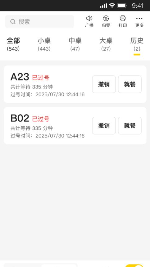 -当顾客过号时,服务员可在"历史订单"中进行"撤销"操作,则过号订单又自动加入到排号队伍中 (未开启过号延号时,不显示"撤销"按钮)
